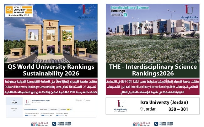 حققت جامعة الإسراء إنجاز أكاديمي جديد تمثل في دخولها لأول مرة في تصنيفين عالميين مرموقين، حيث جاءت الجامعة ضمن المرتبة 1501 عالميًا ضمن التصنيف العالمي QS World University Rankings: Sustainability 2026، وفي الفئة 301-350 في تصنيف Interdisciplinary Science Rankings (THE). حيث يعكس هذا الإنجاز الجهود الكبيرة التي تبذلها الجامعة في مجالات الاستدامة، والبحث العلمي، وتطوير البيئة الأكاديمية، وتعزيز حضورها على الخريطة العالمية للتعليم العالي.
