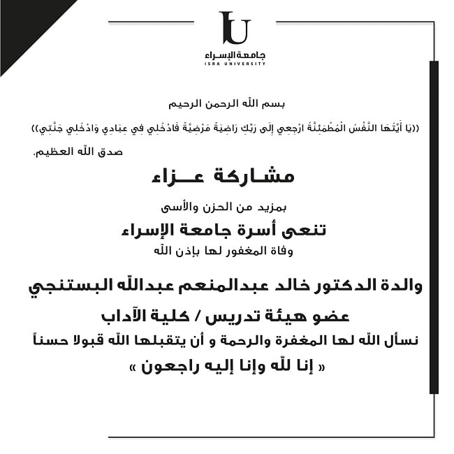 تماشياً مع بلاغ دولة رئيس الوزراء ، قرر معالي الأستاذ الدكتور محمد حامد رئيس الجامعة انهاء دوام العاملين في الجامعة اليوم الاثنين الموافق 12/2/2024 ، الساعة الثانية عصراً، لإتاحة الفرصة للمشاركة باستقبال منتخب النشامى لكرة القدم باستثناء من