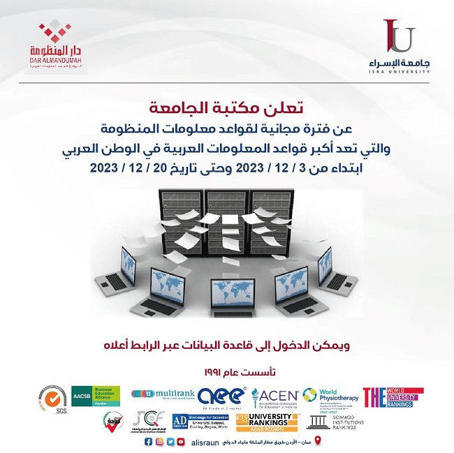 تعلن مكتبة الجامعة عن فترة مجانية لقواعد معلومات المنظومة الدخول إلى القواعد عبر الرابط الآتي : http://search.mandumah.com/