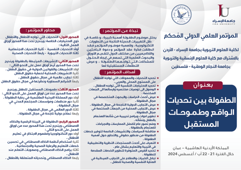 Conference Page : https://www.iu.edu.jo/conference/childhood/ المؤتمر العلمي الدولي المُحكم لكلية العلوم التربوية بجامعة الإسراء – الأردن بالإشتراك مع كلية العلوم الإنسانية...