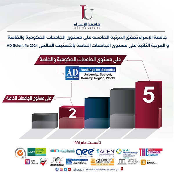 حصلت جامعة الإسراء على مرتبة متقدمة في التصنيف العالمي 2024 AD Scientific المختص بالبحث العلمي والاستشهاد وعاملي التأثير i10-index...