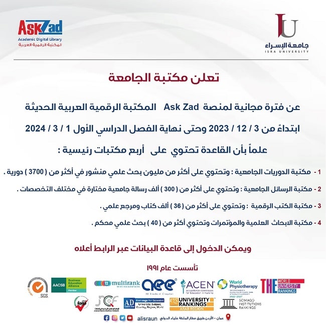 تعلن مكتبة الجامعة عن فترة مجانية لمنصة Ask Zad المكتبة الرقمية العربية الحديثة الدخول إلى القاعدة عبر الرابط الآتي: ...