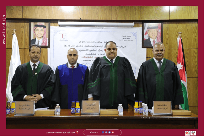 ناقش الطالب عدي يحيى الفلاحات من كلية الآداب بجامعة الإسراء رسالة الماجستير الخاصة به والموسومة ب “ ديوان عشيات وادي...