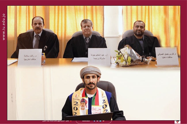 وتكونت لجنة المناقشة من الأستاذ الدكتور عبدالحكيم جودة ( رئيساً ومشرفاً)، والدكتور فارس الصوفي (مناقشاً داخلياً)، والدكتور رأفت سلامة (مناقشاً خارجياً) من جامعة البلقاء التطبيقية .