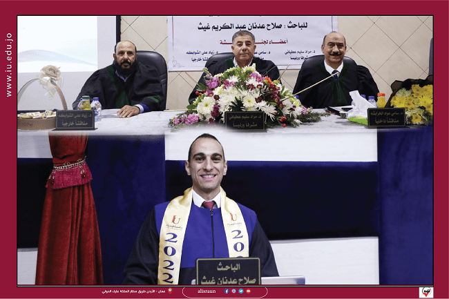 وتكونت لجنة المناقشة من الدكتور مراد العطياني (رئيساً ومشرفاً) والدكتور سامي الخرابشة ( مناقشاً داخلياً) والدكتور زياد الشوابكة (مناقشاً خارجياً ) من جامعة البلقاء التطبيقية .