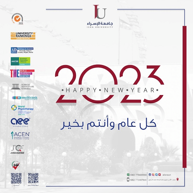 قرر الأستاذ الدكتور أحمد نصيرات رئيس جامعة الإسراء تعطيل الجامعة أعمالها  يوم الأحد الموافق 1/1/2023، بمناسبة رأس السنة الميلادية، بإستثناء من تقتضي  طبيعة عملهم غير ذلك.