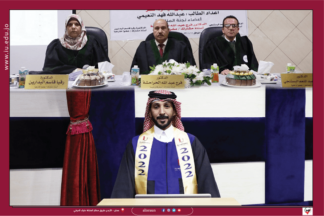 وتكونت لجنة المناقشة من الدكتور فرج الحرحشة (رئيساً ومشرفاً)، والدكتور خالد البستنجي (مناقشاً داخلياً)، والدكتور رقيا البدارين (مناقشاً خارجياً) من جامعة جدارا .