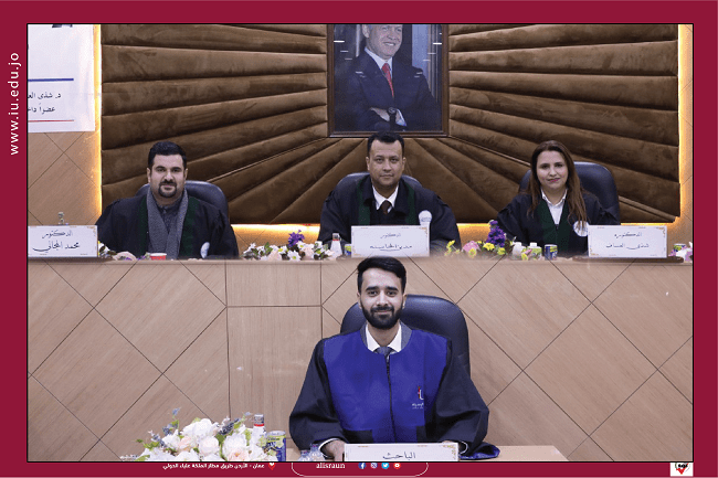 وتكونت لجنة المناقشة من الدكتور مدين المحاسنة ( رئيساً ومشرفاً) والدكتورة شذى العساف ( مناقشاً داخلياً) والدكتور محمد المجالي (مناقشاً خارجياً) من جامعة الزيتونة .