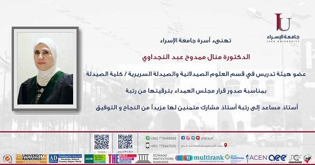 ترقية الدكتورة منال النجداوي إلى رتبة استاذ مشارك في الإسراء Categories أخبار الجامعة Date June 14, 2023 Share: ccadmin Previous post اكاديمية من الإسراء تشارك في المؤتمر العالمي الخامس لكلية الصيدلة June 14, 2023 Next post ندوة حول الريادة والإبداع June 15, 2023 You may also like كلية الصيدلة تنظم زيارة ميدانية إلى مؤسسة الغذاء والدواء ضمن برنامج زيارات التعرض المبكر December 16, 2024 جامعة الإسراء تنظم محاضرة تعريفية حول منح فولبرايت الأمريكية December 15, 2024 زيارة طلبة كلية التمريض في جامعة الإسراء لدائرة المكتبة الوطنية December 15, 2024