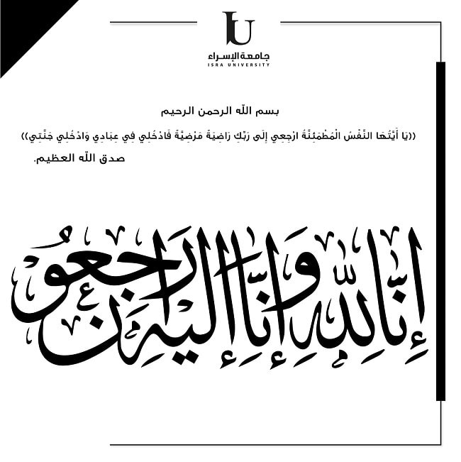 ببالغ الحزن والآسي تتقدم أسرة جامعة الإسراء باحر مشاعر العزاء والمواساة لأهالي وذوي الطلبة الذين وافتهم المنية صباح يوم الأربعاء 13/12/2023 ، أثر حادث السير المؤسف في منطقة سلحوب ، سائلين الله عز وجل أن يتغمدهم بواسع رحمته وأن يسكنهم فسيح جناته وأن يلهم أهلهم وذويهم الصبر والسلوان ، متمنين للمصابين الشفاء العاجل بإذن الله