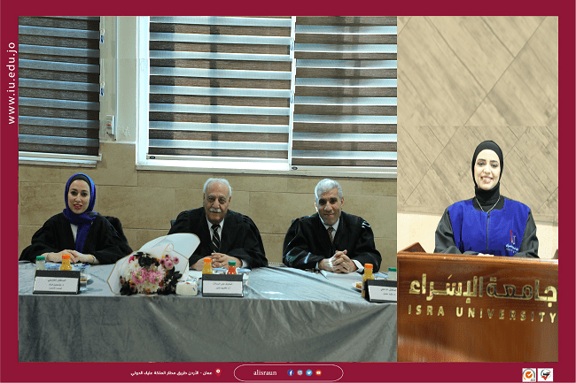 وتكونت لجنة المناقشة من الأستاذ الدكتور كريم سويلم عيسى نمير (رئيساً ومشرفاً ) والدكتور وليد محمد حسن (مناقشاً داخلياً) والدكتورة ياسمين زهير مراد (مناقشاً خارجياً ) من الجامعة الأردنية