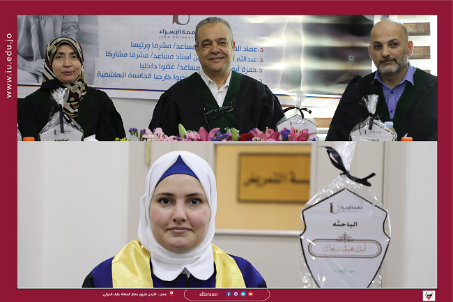 وتكونت لجنة المناقشة من الدكتور عماد حسن الفيومي (رئيساً ومشرفاً ) والدكتور حمزه أبو ناب ( مناقشاً داخلياً ) والدكتورة منى عبدالله محمد عبد (مناقشاً خارجياً) الجامعة الهاشمية