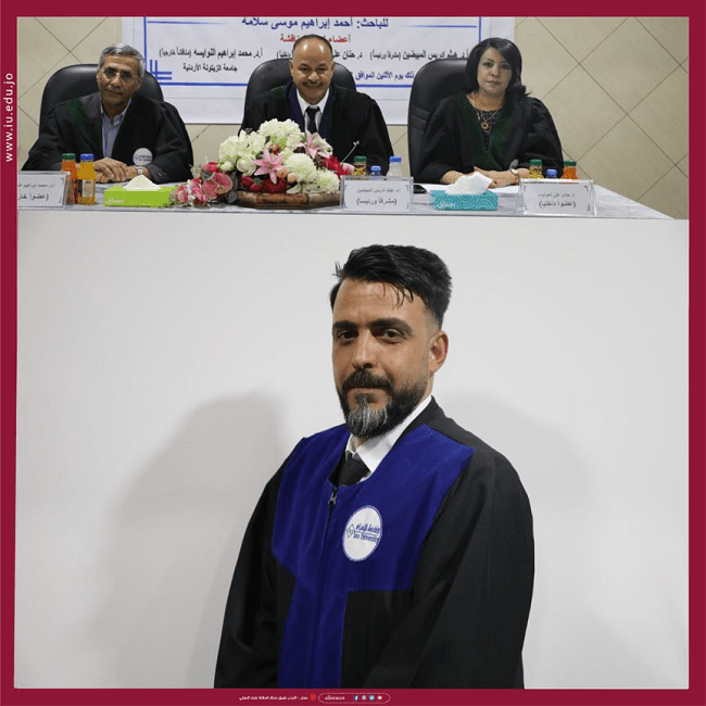 وتكونت لجنة المناقشة من الأستاذ الدكتور هيثم ادريس محمد المبيضين (رئيساً و مشرفاً) و الدكتورة حنان علي العواوده (مناقشاً داخلياً) والأستاذ الدكتور محمد إبراهيم النوايسه (مناقشاً خارجياً) من جامعة الزيتونة .