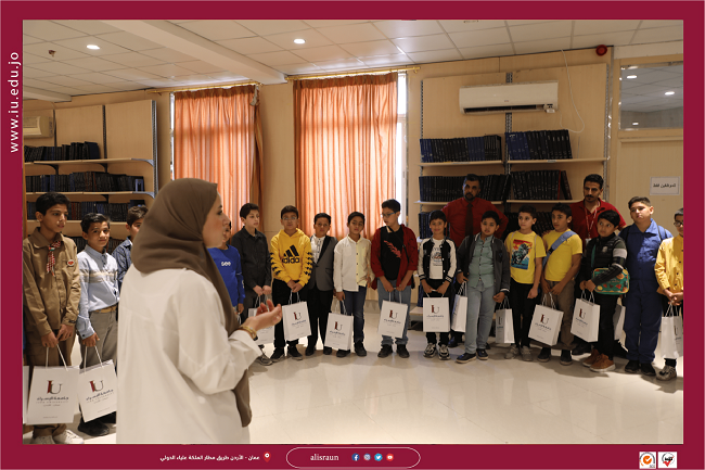 قام وفد من طلبة مدرسة خالد بن الوليد الثانوية للبنين بزيارة علميـة إلى جامعة الإسراء ، وذلك لغايات البحث العلمي لطلبة الثانوي وطلبة الأساسي لغايات تحدي القراءة و التعرف إلى الجامعة وأهدافها والتخصصات العلمية والأكاديمية والإدارية والإنسانية المتاحة ونظام التدريــس فيها.