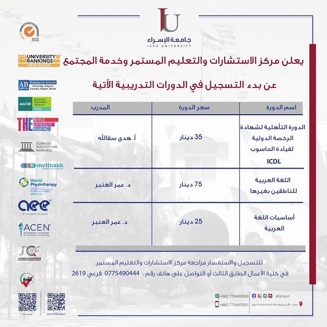 يعلن مركز الإستشارات والتعليم المستمر وخدمة المجتمع عن بدء التسجيل في الدورات التدريبية الآتية : Categories إعلانات الطلبة Date May 8, 2023 Share: ccadmin Previous post جامعة الإسراء تعقد ورشة تدريبية بعنوان "مقدمة في المحاسبة العملية المهنية الشامل" May 8, 2023 Next post جامعة الإسراء تشارك في ملتقى العلاج بالفن في جامعة سوسة / تونس May 8, 2023 You may also like اعلان للطلبة الخريجين December 10, 2024 الورشة التدريبية بعنوان : DOSE CALCULATION – حساب الجرعات الدوائية December 10, 2024 محاضرة حول البرامج والمنح التي تقدمها “FULBRIGHT “ December 5, 2024