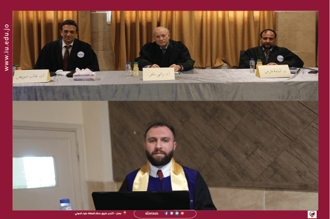وتكونت لجنة المناقشة من الأستاذ الدكتور رامي عبد القادر ماهر (رئيساً ومشرفاً) والدكتور أسامة عقلة فارس (مناقشاً داخلياً) والأستاذ الدكتور غالب جليل أيوب صويص (مناقشاً خارجياً) الجامعة الأردنية.