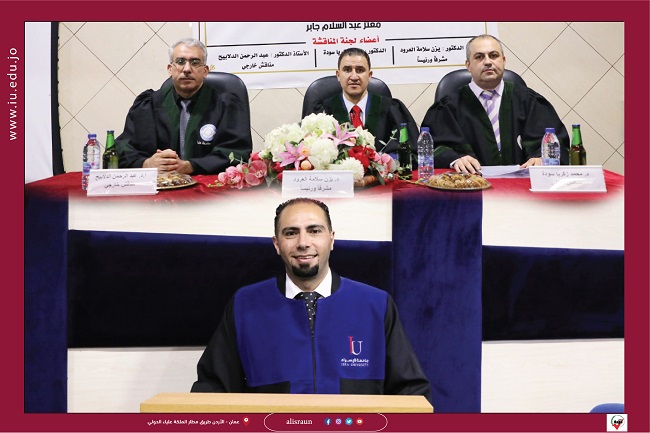 وتكونت لجنة المناقشة من الدكتور يزن العرود رئيساً ومشرفاً، والدكتور محمد سودة مناقشاً داخلياً، والأستاذ الدكتور عبدالرحمن الدلابيح مناقشاً خارجياً من” جامعة آل البيت “.