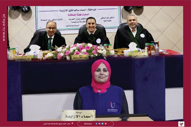 وتكونت لجنة المناقشة من الدكتور يزن العرود رئيساً ومشرفاً، والدكتور سعد الساكني مناقشاً داخلياً، والأستاذ الدكتور نمر السليحات مناقشاً خارجياً من ” جامعة عمان العربية “.