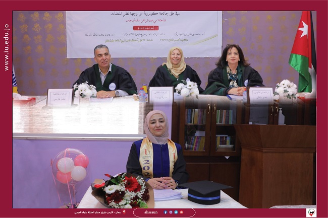 وتكونت لجنة المناقشة من الأستاذ الدكتور هناء الفلفلي رئيساً ومشرفاً، والدكتور انتصار طنوس مناقشاً داخلياً، والأستاذ الدكتور فؤاد طلافحة مناقشاً خارجياً من “جامعة مؤتة “.