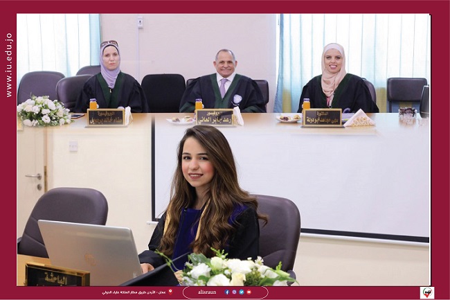 وتكونت لجنة المناقشة من الأستاذ الدكتور رعد العاني مشرفاً ورئيساً، والدكتور سهى أبودولة مناقشاً داخلياً ، والأستاذ الدكتور سناء بردويل مناقشاً خارجياً (الجامعة الأردنية ).