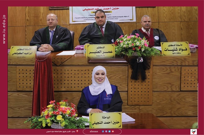 وتكونت لجنة المناقشة من الدكتور عمر العنبر مشرفاً ورئيساً، والأستاذ الدكتور فؤاد شتيات مناقشاً داخلياً، والأستاذ الدكتور إبراهيم الكوفحي مناقشاً خارجياً من “الجامعة الأردنية “.