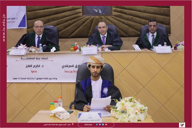 وقد تكونت لجنة المناقشـة من الدكتور طارق الصرفندي / مشـرفاً ورئيــساً والأستاذ الدكتور أكرم الفايز /مناقشاً داخلياً والأستاذ الدكتور صالح حجازي /مناقشاً خارجياً من “جامعة عمان الأهلية “.
