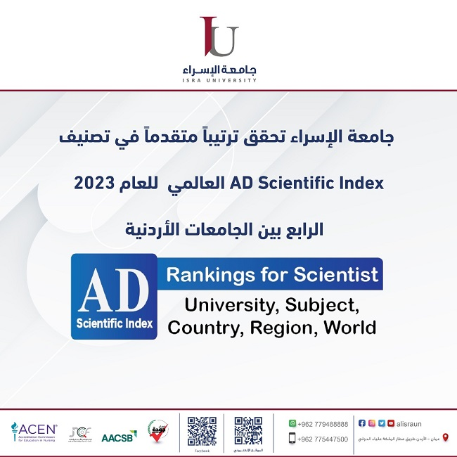 تهنئ جامعة الإسراء جميع الباحثين والمنتسبين اليها على ما حققوه من مراكز متقدمة في تصنيف AD Scientific Index العالمي للعام 2023 والذي وضع جامعة الإسراء في الترتيب الرابع على مستوى جميع الجامعات الحكومية والخاصة وعددها 32 جامعة ومؤسسة تعليمية اردنية. يختص هذا التصنيف في قياس تأثير الأبحاث العلمية، ويدل هذا التقدم في هذا التصنيف وللعام الثاني على التوالي دليلاً على الاهتمام والوعي لدى الجامعة ومنتسبيها في ضرورة جعل البحث العلمي المؤثر من الأولويات القصوى.