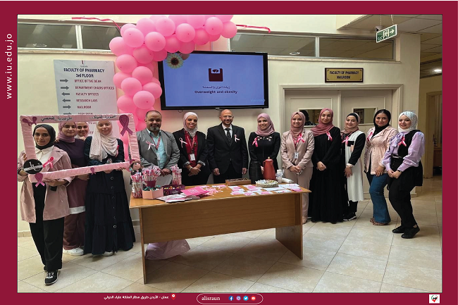 نظَّمت لجنة الأنشطة الطلابية في كُلية الصيدلة حَملة توعوية حول أهمية الكَشف المُبكر عن سرطان ، وذلك بمُناسبة الشهر العالمي للتوعية بسرطان الثدي، وبحضور الأستاذ الدكتور أمجد أبو رميلة ( عميد الكلية ) وأعضاء الهيئة التدريسية في الكلية .