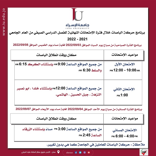 حركة الباصات خلال فترة الامتحانات النهائية Categories إعلانات الطلبة Date August 29, 2022 Share: ccadmin Previous post حفل تخريج الفوج الرابع لطلبة الدبلومات التدريبية في " الإسراء " August 29, 2022 Next post الإسراء تشارك في "إطلاق الحملة الوطنية لتعزيز المشاركة السياسية "المشاركة مسؤولية الجميع" August 29, 2022 You may also like اعلان للطلبة الخريجين December 10, 2024 الورشة التدريبية بعنوان : DOSE CALCULATION – حساب الجرعات الدوائية December 10, 2024 محاضرة حول البرامج والمنح التي تقدمها “FULBRIGHT “ December 5, 2024
