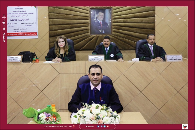 وقد تكونت لجنة المناقشـة من الدكتور علي الزعبي / مشـرفاً ورئيــساً والدكتور محمد القهيوي /مناقشاً داخلياً والأستاذ الدكتور ناديا قزمار /مناقشاً خارجياً من “جامعة جرش “.