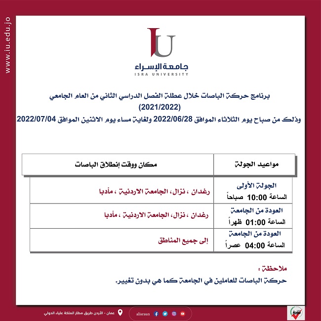 برنامج حركة الباصات خلال عطلة الفصل الدراسي الثاني من العام الجامعي (2021/2022) Categories إعلانات الجامعة Date June 27, 2022 Share: ccadmin Previous post الصيدلة في "الإسراء" تناقش رسالة ماجستير في تخصص العلوم الصيدلانية June 27, 2022 Next post أسرة جامعة الإسراء تهنئ صاحب السمو الملكي الأمير الحسين بن عبد الله الثاني ولي العهد بمناسبة عيد ميلاده الميمون. June 28, 2022 You may also like فترة تجريبية لقاعدة البيانات الإلكترونية YouScribe والخاصة بالكتب الإلكترونية December 5, 2024 محاضرة تعريفية عن المنح الدراسية للطلاب في المانيا و تمويل المشاريع November 17, 2024 ملاعب padel الإسراء November 7, 2024