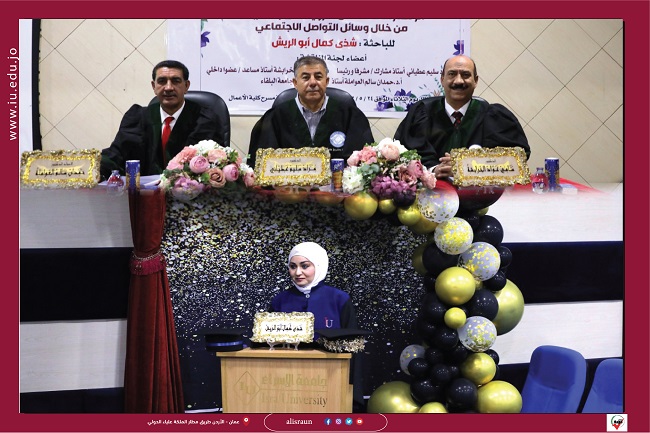وتكونت لجنة المناقشة من الدكتور مراد العطياني رئيساً ومشرفاً، والدكتور سامي الخرابشة مناقشاً داخلياً، والأستاذ الدكتور حمدان العواملة مناقشاً خارجياً من” جامعة البلقاء التطبيقية “.