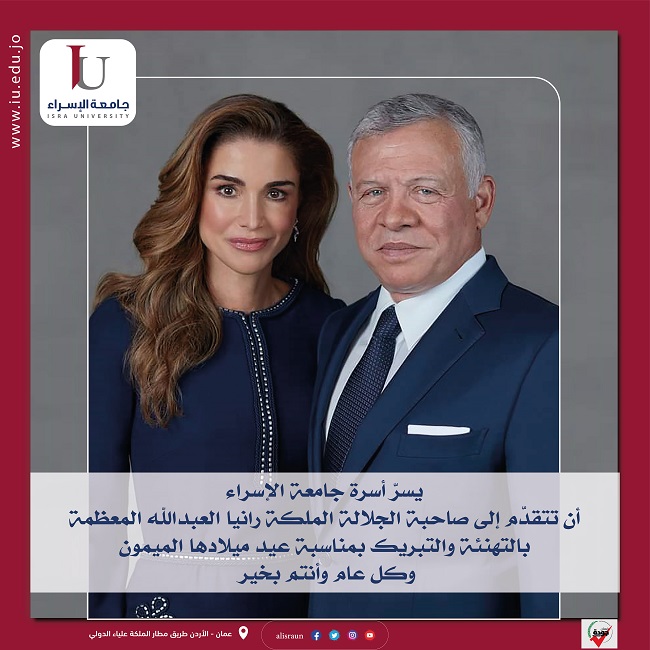 تتقدم أسرة جامعة الإسراء من صاحبة الجلالة الملكة رانيا العبدالله بالتهنئة في عيد ميلادها الميمون ونتمنى لها موفور الصحة والعافية .