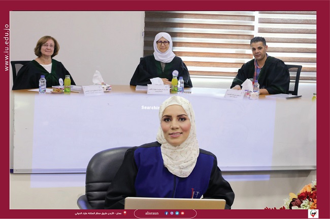 وتكونت لجنة المناقشة من الأستاذ الدكتور وفيقة ظاهر مشرفاً ورئيساً، والدكتور عبدالله الغنميين مناقشاً داخلياً ، والأستاذ الدكتور منار النابلسي مناقشاً خارجياً (الجامعة الأردنية ).