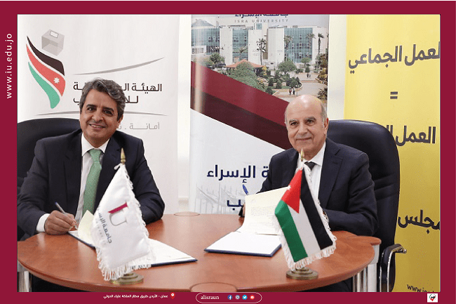 وقعت جامعة الإسراء والهيئة المستقلة للانتخاب مذكرة تفاهم لنشر التوعية بين الطلبة بالعمل السياسي والعملية الانتخابية، وتبادل الخبرات في موضوعات إدارة العملية الانتخابية النيابية، وانتخابات المجالس البلدية، ومجالس المحافظات، ومجلس أمانة عمان، بالإضافة إلى توعيتهم بالمشاركة السياسية والحزبية وأهمية الانخراط في الأحزاب السياسية .