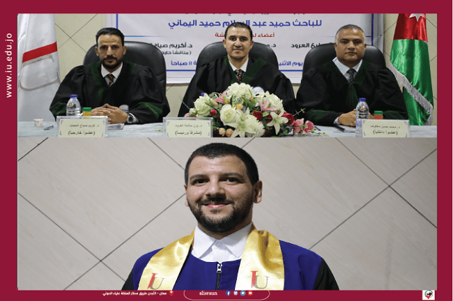 وتكونت لجنة المناقشة من الدكتور يزن سلامه مطيع العرود  (رئيساً ومشرفاً )   والدكتور محمد حسن مخلوف    ( مناقشاً داخلياً ) الدكتور اكريم صياح سليمان الحجايا (مناقشاً خارجياً) .