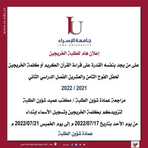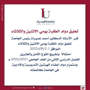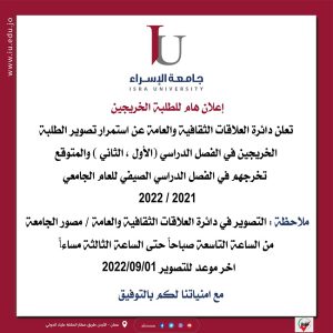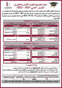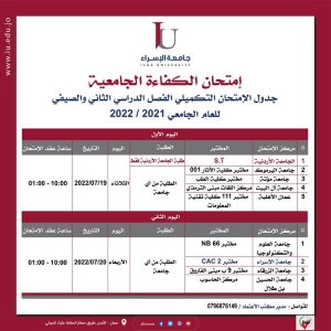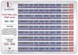 برنامج حركة الباصات خلال فترة الامتحانات النهائية للفصل الدراسي الثاني من العام الجامعي (2021-2022) June 8, 2022 Read More »