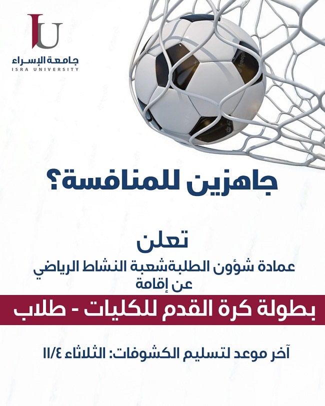 تعلن عمادة شؤون الطلبة/ شعبة النشاط الرياضي عن إقامة بطولة كرة القدم – للكليات / طلاب
